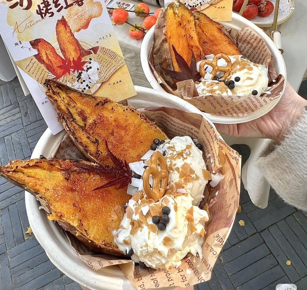 在烤得焦黑流油的红心蜜薯中间填入丝滑的冰激凌,再撒上桂花碎或焦糖脆片,一口下去,感受“冰火两重天”的美味。