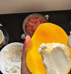 首先,把芒果削皮对半切块。 然后,把椰浆少量多次倒进酸奶混合成不易流动的淡奶油状,将其均匀抹在芒果果肉上。 最后,铺满剥好的柚子粒,将其放冰箱冷冻20分钟就完成了。小贴士:芒果建议选择成熟度适中的,口感更甜。酸奶可依个人口味选择,干噎酸奶口感更浓郁。